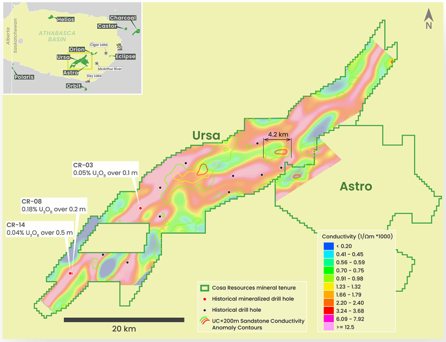 Airborne geophysics at Cosa's Ursa project has identified several high-priority target areas. Conductivity anomalies in the sandstone may reflect hydrothermal alteration zones like those associated with McArthur River, Cigar Lake, and Hurricane, some of the largest and highest-grade deposits on earth. The Ursa project is large enough to potentially host several large uranium deposits.