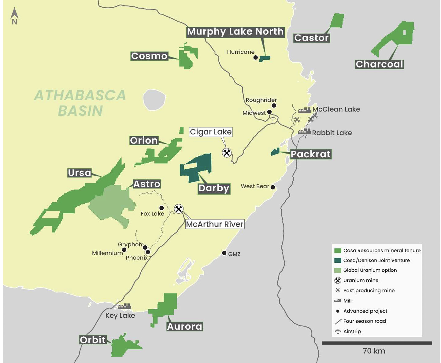 Vancouver, British Columbia, December 17, 2025 – Cosa Resources Corp. (TSX-V: COSA) (OTCQB: COSAF) (FSE: SSKU) (“Cosa” or the “Company”) is pleased to report that exploration plans have been approved for the Company’s Darby and Murphy Lake North (MLN) projects. Darby and MLN are joint ventures (the “Joint Venture”) between Cosa and Denison Mines Corp. (“Denison”) (TSX: DML) (NYSE American: DNN) and are located 10 kilometres west of Cameco’s Cigar Lake Mine and three kilometres east of IsoEnergy’s Hurricane Deposit, respectively, in the eastern Athabasca Basin, Saskatchewan. Cosa is the operator of both projects and holds a 70% interest with Denison holding a 30% interest in each.