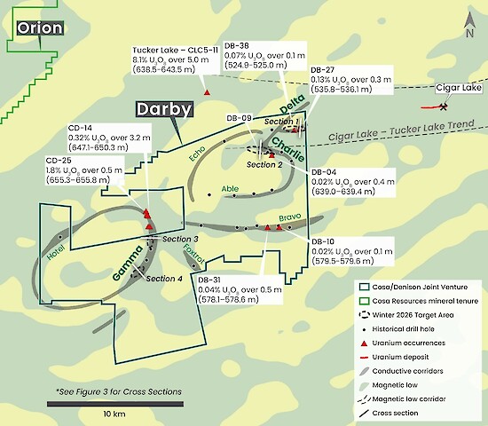 Located 10 kilometres west of the Cigar Lake Mine, Darby contains multiple prospective conductive trends and several historical intersections of weak uranium mineralization (Figures 1 and 2). Historical drilling demonstrates that many of these trends are highly prospective for uranium deposits characteristic of the eastern Athabasca Basin, yet most of the strike length has not been effectively evaluated. Work by Cosa in 2025 prioritized these trends and identified several historical drill holes with results that suggest proximity to uranium mineralization (See Cosa’s news release dated October 24, 2025).