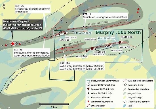 Andy Carmichael, Vice President of Exploration, commented: “Retention of high-quality data by Denison combined with the experience gained over the last 15 years has allowed us to identify what may be some of the last remaining high-caliber untested target areas near Cigar Lake. Darby hosts five historical intersections of mineralization proximal to untested structures across multiple trends. Our initial target areas have coincident untested structures, alteration, and anomalous uranium content in the lower sandstone. At MLN, we are eager to continue testing large gaps in strike where compelling structure and alteration have been intersected by widely spaced drilling on the Cyclone trend. Evaluation of an additional trend south of Cyclone is also a priority objective for this winter. Our decision to prioritize targets under frozen lakes, combined with a property-wide DC-Resistivity survey planned for the spring, is aimed at identifying the most prospective targets for an expanded follow up campaign in the summer.”