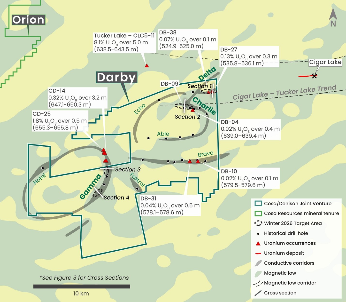 Located 10 kilometres west of the Cigar Lake Mine, Darby contains multiple prospective conductive trends and several historical intersections of weak uranium mineralization (Figures 1 and 2). Historical drilling demonstrates that many of these trends are highly prospective for uranium deposits characteristic of the eastern Athabasca Basin, yet most of the strike length has not been effectively evaluated. Work by Cosa in 2025 prioritized these trends and identified several historical drill holes with results that suggest proximity to uranium mineralization (See Cosa’s news release dated October 24, 2025).