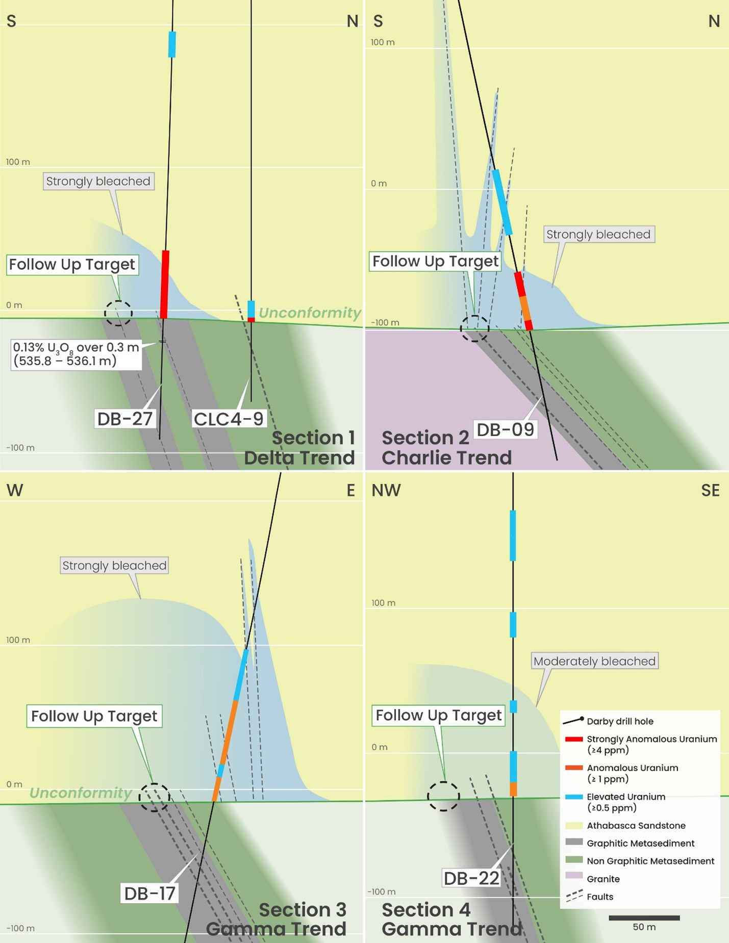 Historical hole DB-17 intersected continuously elevated to anomalous uranium content in the basal 108 metres of sandstone with coincident clay alteration and bleached zones (Figure 3). Graphitic faults were intersected 45 and 55 metres below the unconformity. The intersection of these graphitic faults with the unconformity, proximal to highly anomalous uranium in the lower sandstone, is the initial follow up target at Gamma in winter 2026. Over 2.5 kilometres to the south, drill hole DB-22 intersected several intervals of elevated to anomalous sandstone uranium content above basement metasediments that were altered near the end of the drill hole. Follow up of DB-22 is a priority target.