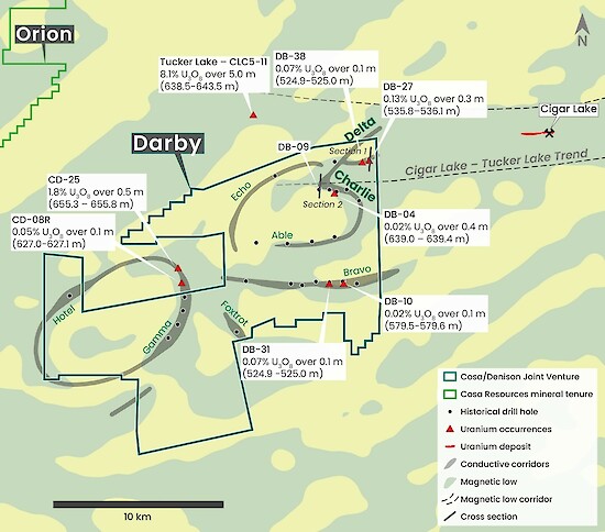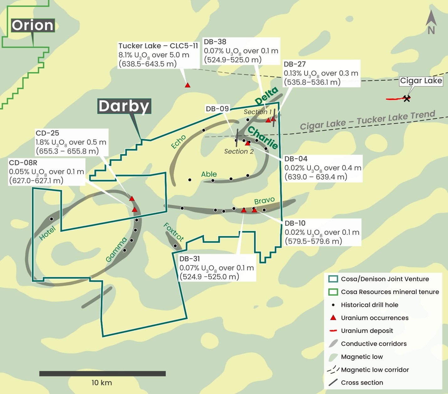 Located 10 kilometres west of the Cigar Lake Mine, Darby contains multiple prospective conductive trends and several historical intersections of weak uranium mineralization (Figure 2). Historical drilling has proven that many of these trends are highly prospective for uranium deposits of the eastern Athabasca Basin, yet the majority of the strike length has not been effectively tested. Work by Cosa in 2025 has prioritized these trends and identified several historical drill holes with results that suggest proximity to uranium mineralization.