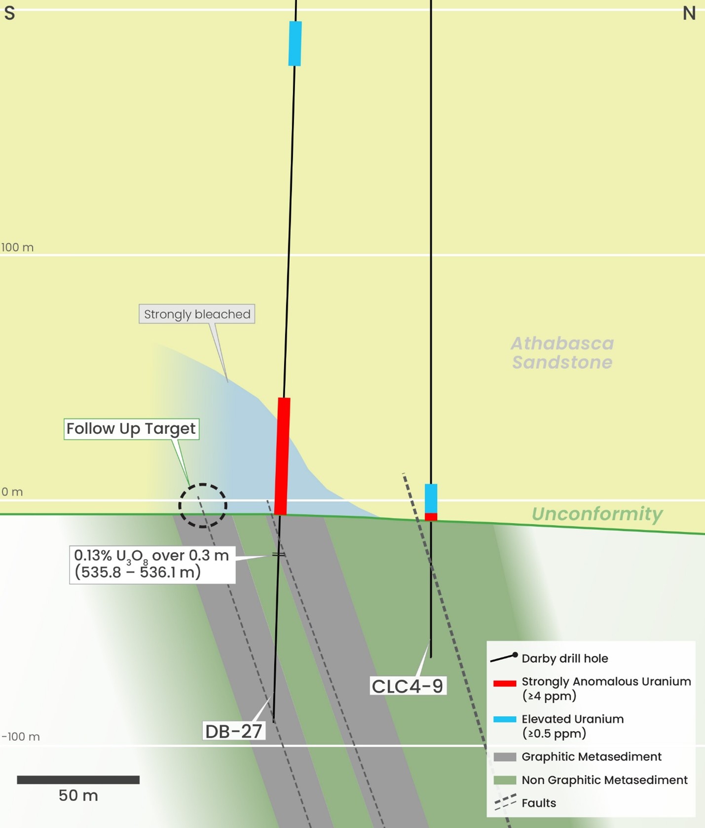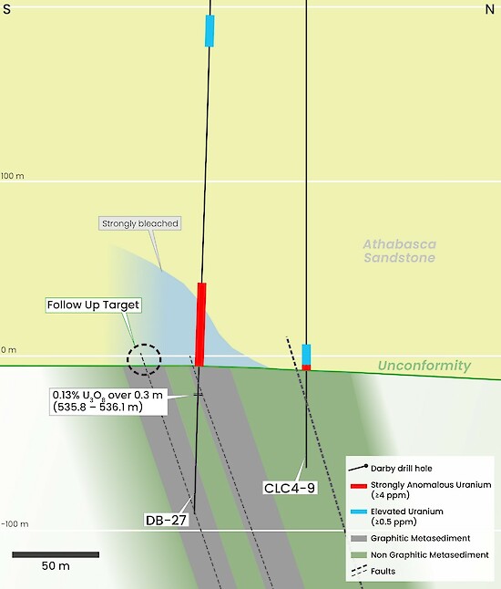 Follow up of historical drill hole DB-27 is planned in 2026. The basal sandstone in DB-27 is pervasively bleached with illite and chlorite enrichment and includes a 52-metre interval of anomalous uranium content (Figure 3). In the basement, DB-27 intersected 0.13% U3O8 over 0.3 metres roughly 16 metres below the unconformity, and graphitic faulting 80 metres below the unconformity. The intersection of basement faulting with the unconformity is a high priority follow up target on section and along strike, further upgraded by the presence of anomalous uranium in the overlying sandstone.