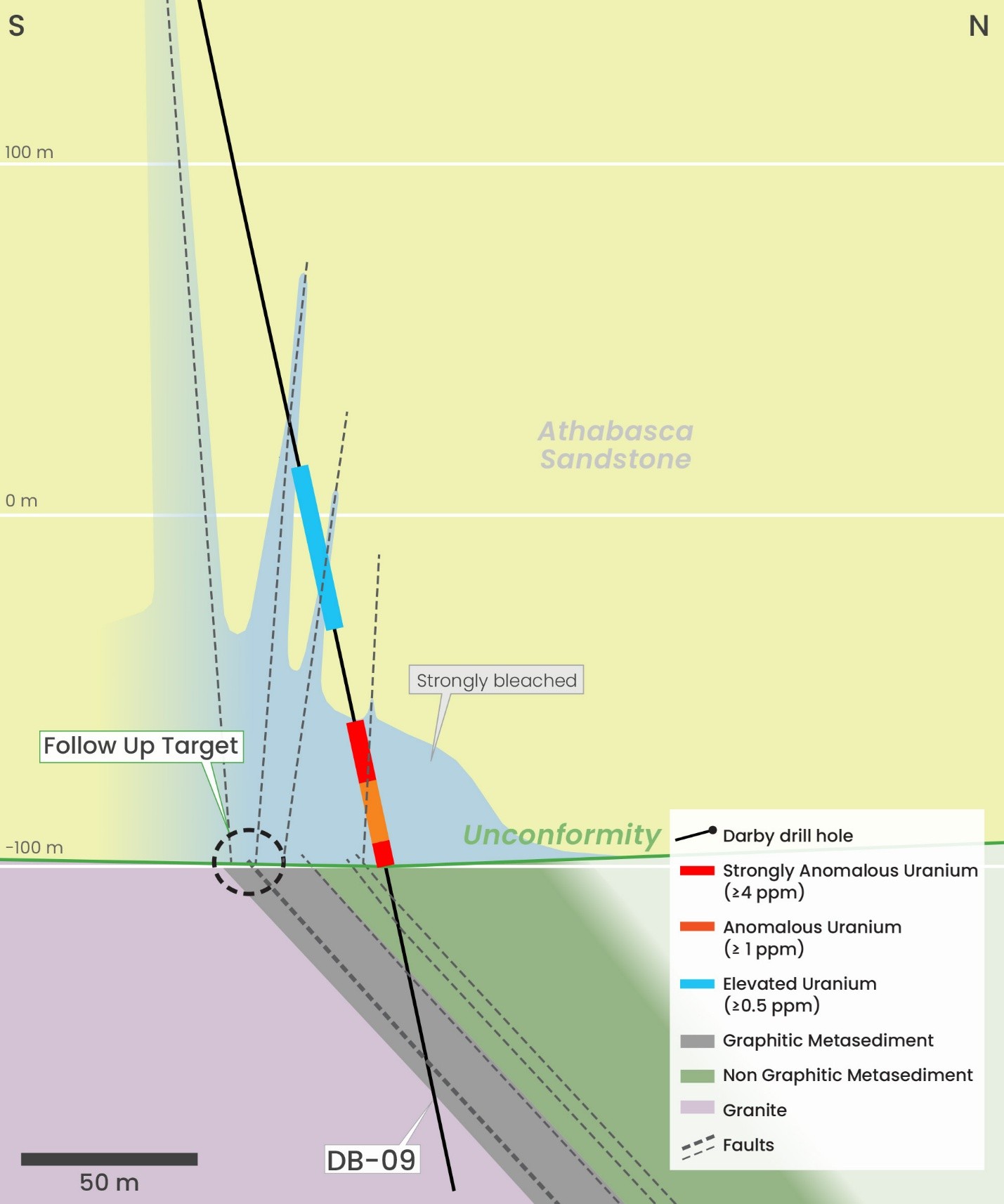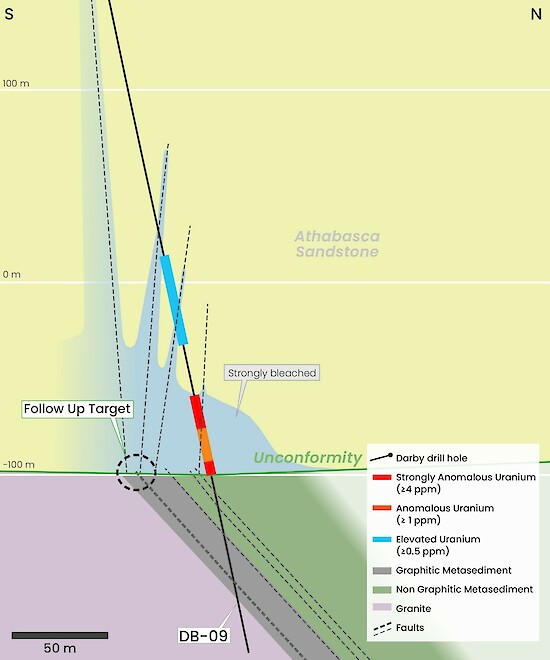 DB-09, the westernmost drill hole on trend, intersected multiple zones of elevated to anomalous uranium content in the lower 115 metres of sandstone (Figure 4). Notably, the basal sandstone contains continuously anomalous uranium over 42 metres, illite and chlorite enrichment, bleaching, and hydrothermal hematite. In the basement, DB-09 intersected graphitic faulting 30 to 60 metres below the unconformity. The intersection of these graphitic faults with the unconformity, proximal to highly anomalous uranium in the lower sandstone, is considered a high priority follow up target on section and along strike.